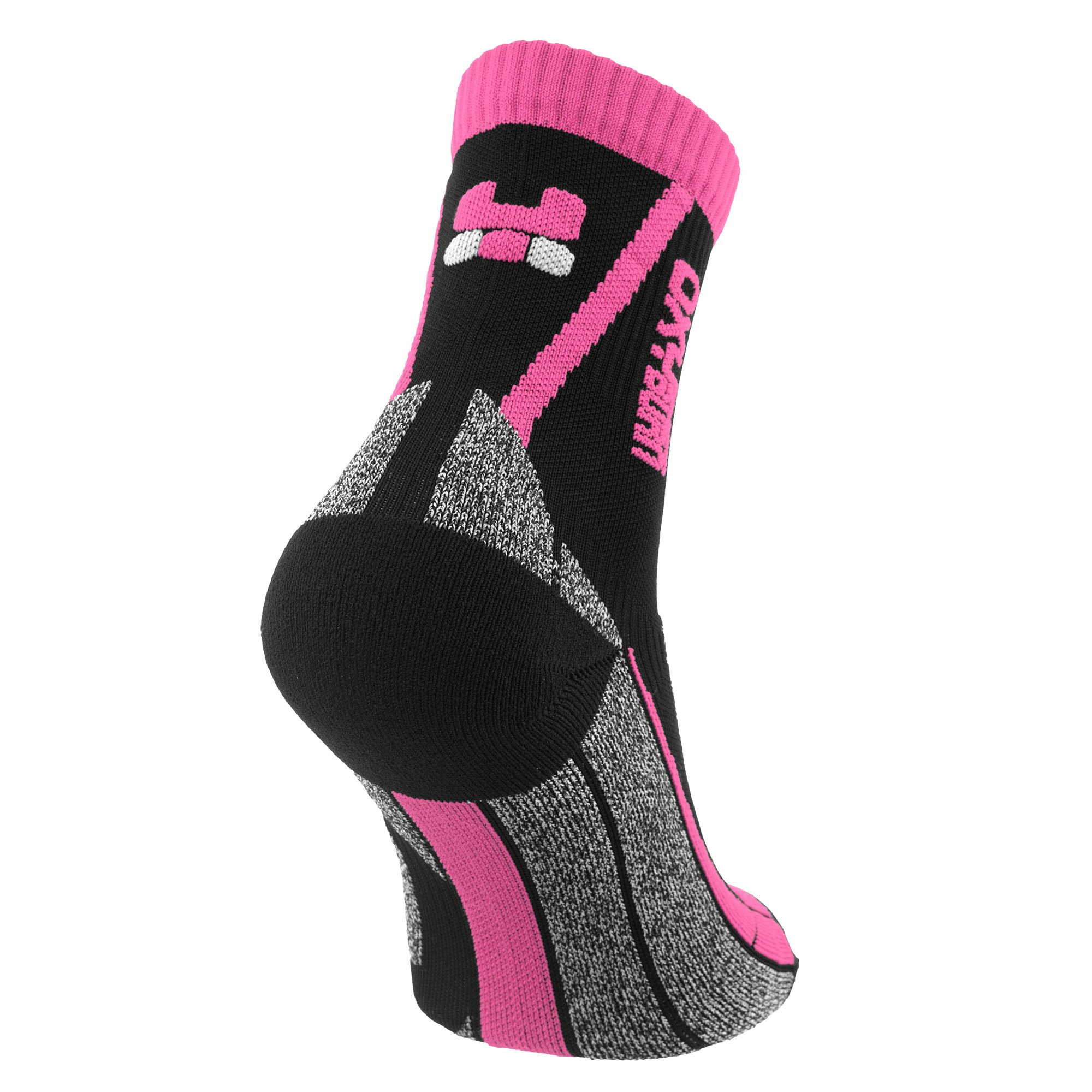 Skarpetki na rower Oxyburn BIKE MTB wykonane zostały z materiałów najwyższej jakości. Ten zaawansowany technologicznie produkt posiada techniczną strukturę, zgodną z anatomiczną budową nóg, która zapewnia idealne dopasowanie oraz jeszcze lepsze wsparcie. Gęsta, wyjątkowo zwarta konstrukcja z tyłu, nad piętą odpowiada za ochronę ścięgna Achillesa, a anatomiczne poduszki ochronne podeszwy stopy odpowiadają za ochronę przed otarciami i tłumienie wstrząsów. Dodatkowo wstawki z oddychającej siateczki zapewniają idealny mikroklimat, przez odprowadzenie nadmiaru wilgoci i ciepłą na zewnątrz. Właściwości antybakteryjne zapewniają natomiast wysoki poziom higieny, nawet przy bardzo intensywnym treningu.