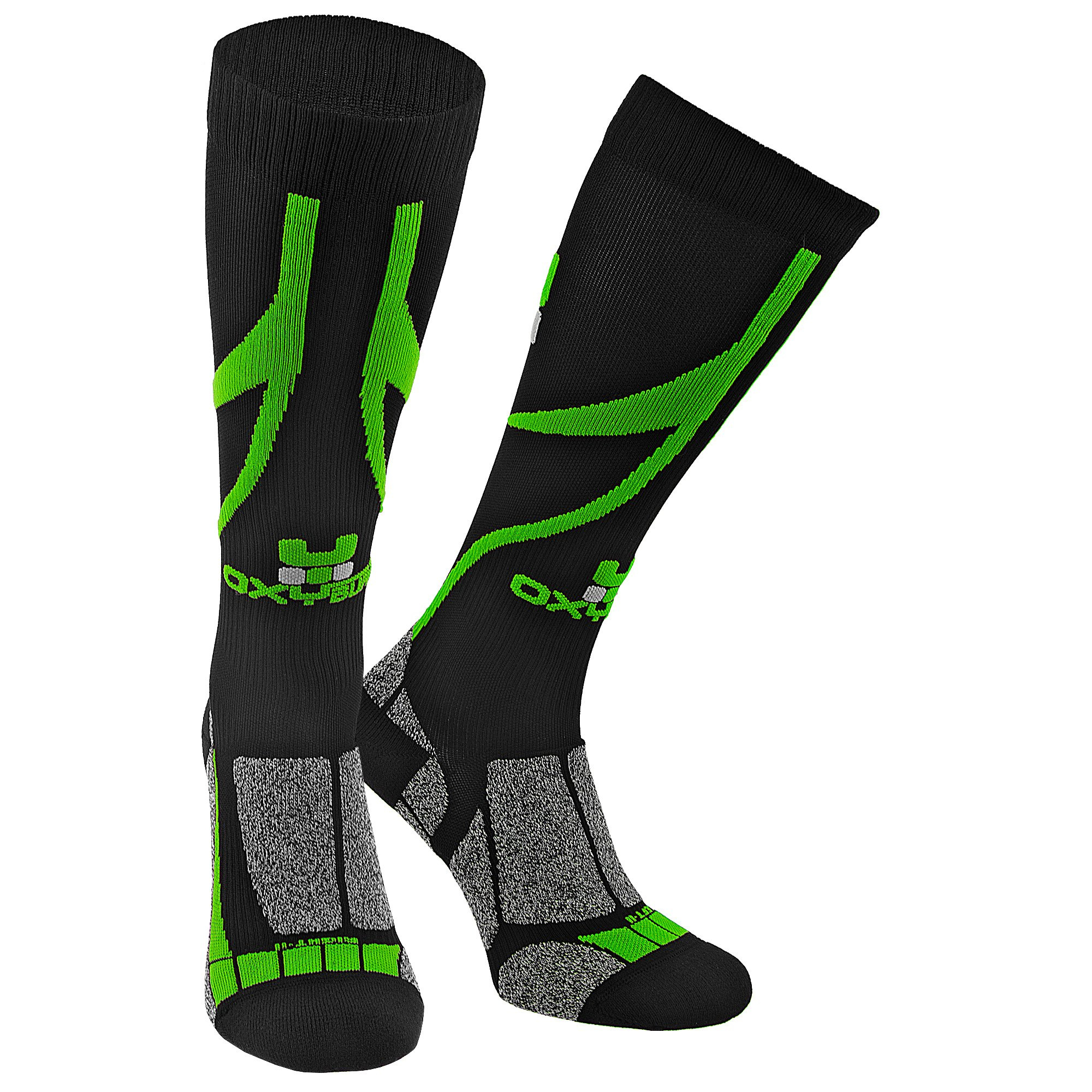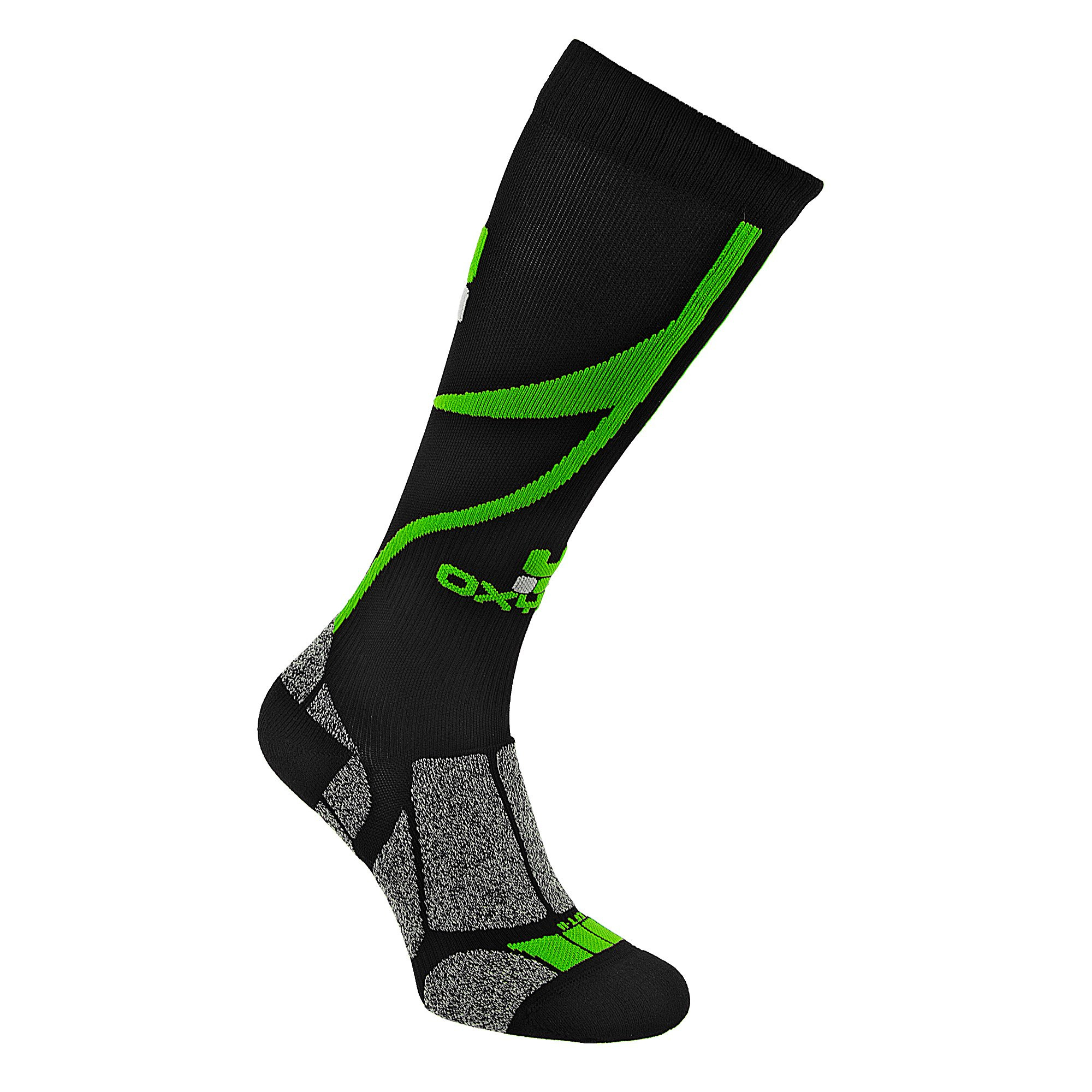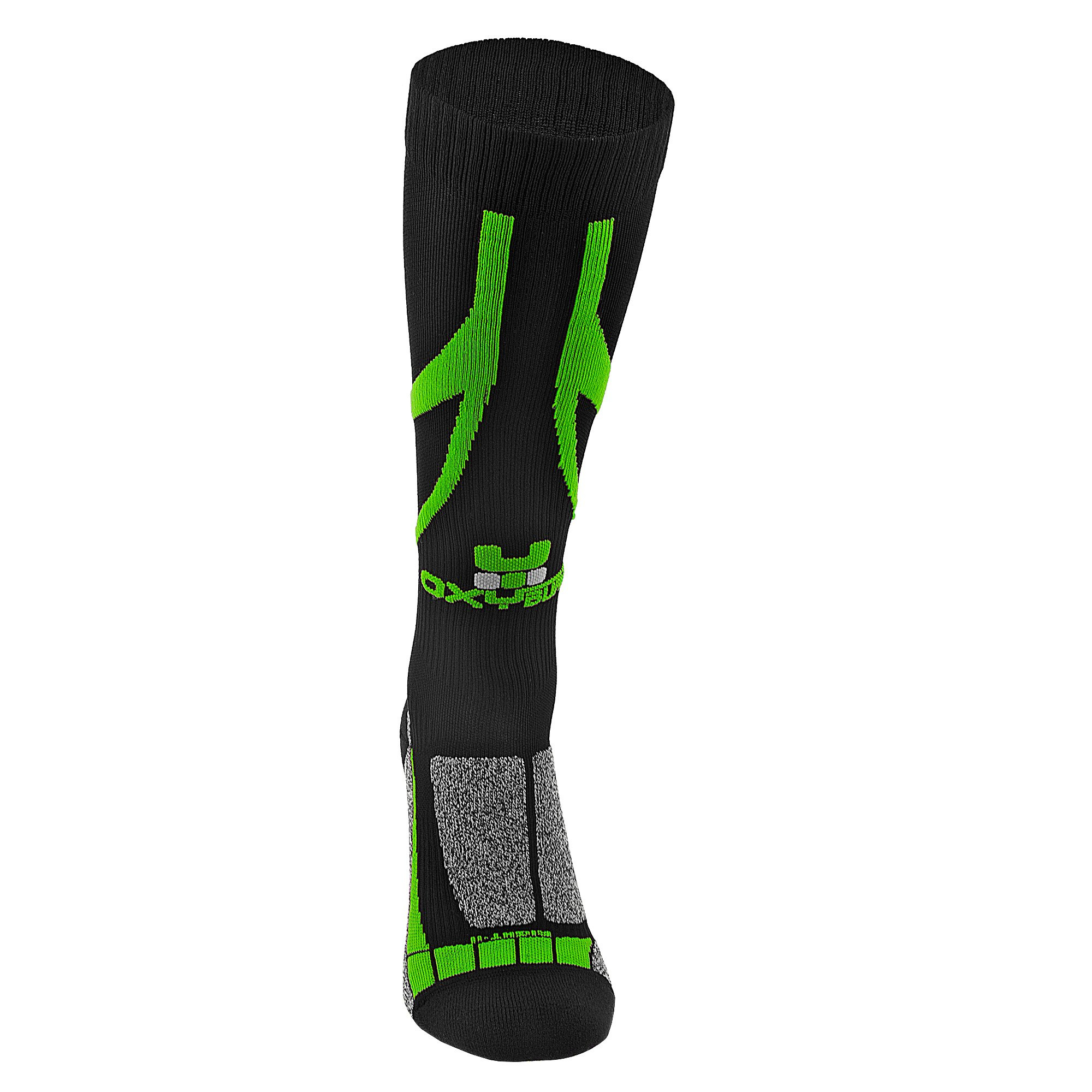 Wysoka kompresja (III poziom - PERFORMANCE) zastosowana w skarpetach rowerowych Oxyburn BIKE MTB powoduje spójny nacisk oddziaływający na mięśnie, ciągle i efektywnie zmniejszając średnicę żył pchając odtlenioną krew do serca i pozwalając odpocząć tętnicom, a także zwiększyć natlenienie mięśni. Więcej tlenu oznacza więcej energii, a co za tym idzie lepszą wydajność. Ten stopień kompresji powinien być stosowany na średnich i długich dystansach, gdzie mięśnie są zmęczone i obciążone. Pozwala to sportowcowi przekraczać swoje granice i osiągnąć wysoką wydajność, opóźniając powstawanie kwasu mlekowego.